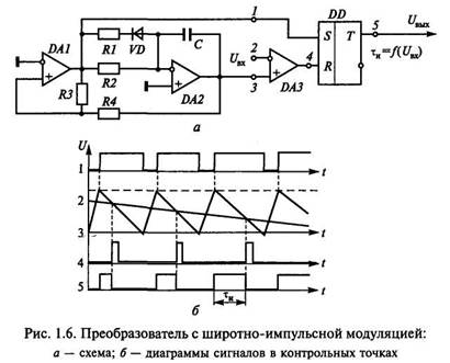 Преобразование непрерывной величины с амплитудной модуляцией в сигнал с широтно-импульсной модуляцией можно осуществить с помощью устройства, схема которого, а также диаграммы, поясняющие принцип его работы, приведены на рис.1.6. Устройство содержит генератор линейно изменяющегося напряжения (ГЛН), выполненный на операционных усилителях DA1, DA2, устройство сравнения УСр, выполненное на операционном усилителе DA3, и триггер DD.