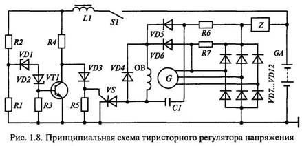На рис.1.8. приведена принципиальная схема тиристорного регулятора напряжения с естественной коммутацией. В регуляторе напряжения функции регулирующего органа выполняет тиристор VS. В анодную цепь тиристора включена обмотка возбуждения ОВ генератора. Обмотка возбуждения шунтируется диодом VD4. Чтобы обеспечить естественную коммутацию, тиристор подключен к генератору через однофазный двухполупериодный выпрямитель, образованный двумя диодами выпрямителя генератора и двумя вспомогательными диодами VD5, VD6. Для обеспечения возбуждения генератора к обмотке возбуждения подводится напряжение аккумуляторных батарей через резисторы R6nR7. Для улучшения условий коммутации тиристора применен конденсатор С1.