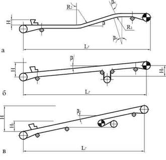 Трасса конвейера (см. рис. 1) по возможности должна быть прямолинейной или с минимальным числом перегибов, а длина и высота подъема должна обеспечиваться существующим оборудованием, т. е. тяговой способностью привода и прочности ленты. Угол наклона конвейера или отдельных его участков β, а также угол поворота трассы βк должны быть не более допустимых. Радиусы криволинейных участков – выпуклых R1 и вогнутых R2 – не должны быть менее рекомендуемых или расчетных, так как в противном случае на выпуклых участках возникают недопустимые нагрузки на роликоопоры, а на вогнутых лента поднимается над роликоопорами, что крайне нежелательно.