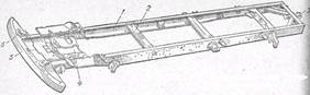 1 – продольная балка (лонжерон); 2 – поперечная балка; 3 – буксирное устройство; 4 – передняя поперечная балка (установка двигателя); 5 – буфер; 6 – буксировочные крюки.