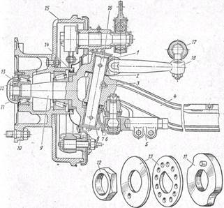 1 и 8 — втулки шкворня; 2 — регулировочные прокладки; 3 — клиновой болт; 4 — балка моста; 5 —.поперечная рулевая тяга; 6 и 7 — шайбы опорного подшипника; 9 — поворотная цапфа; 10 —"ступица колеса; 11 — регулировочная гайка; 12 — контргайка; 13 — замочное кольцо и шайба; 14 — сальник; 15 — тормозной барабан; 16 — шкворень; 17 — продольная рулевая тяга; 18 — поворотный рычаг