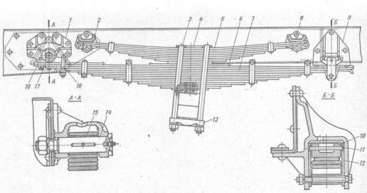 Подвеска выполненная из двух продольных полуэллиптических листовых рессор 7 и двух подрессорников 5. Подрессорник размещен сверху основной рессоры и совместно с ней прикреплен к балке заднего моста с помощью рессорных стремянок 3 и накладок 4 и 13. Между основной рессорой и подрессорником установлен промежуточный лист 6. Для передачи нагрузки на подрессорник к раме приклепаны кронштейны 2 и 8. Передний конец основной рессоры неподвижный. Он прикреплен к раме в кронштейне 1 с помощью съемного ушка 18 и гладкого шарнира, состоящего из пальца 14 и втулки 15, которая запрессована в ушко. Ушко 18 закреплено на коренном листе, на прокладке 17 двумя болтами и стремянкой 16. Задний конец рессоры скользящий, он свободно установлен в кронштейне 9, приклепанном к раме, и опирается на сухарь 10. К заднему концу рессоры приклепана накладка, предохраняющая от износа коренной лист. Для предохранения от износа стенок кронштейна на пальце 11 сухаря установлены вкладыши 12.
