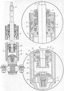 Гидроамортизаторы по конструкции разделяются на телескопические и рычажные. В подвесках современных автомобилей применяются в основном телескопические амортизаторы двустороннего действия. На рис. 5 представлена конструкция, гидравлического амортизатора телескопического типа двустороннего действия. Амортизатор состоит из трех основных узлов: цилиндра 18 с днищем 23, поршня 20 со штоком 5 и направляющей втулки 2 с уплотнениями. Шток 5 прикреплен к кузову автомобиля, а цилиндр соединен с колесом, вследствие чего поршень перемещается внутри цилиндра при колебаниях кузова и колес автомобиля.
