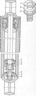Перепускной клапан имеет слаб 0 пружину и закрывает сверху сквозные отверстия, выполненные в днище по окружности. Цилиндр заполнен специальной амортизаторной жидкостью. Долговечность телескопического амортизатора во многом зависит от надежности сальников 7 и 8 штока, препятствующих вытеканию жидкости из рабочего цилиндра и попаданию внутрь него пыли, влаги и грязи. Гребенчатый сальник 8, изготовляемый из бензомасло стойкой резины, препятствует вытеканию жидкости из рабочего цилиндра при перемещениях штока поршня. Этот сальник находится в обойме 9 и поджимается пружиной 3. На внутренней его поверхности выполнены гребешки и канавки.