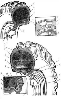 1 – бортовое кольцо; 2- диск; 3 – покрышка;4 – камера; 5 – распорное кольцо; 6 – обод; 7 – балансир; 8 – ободная лента;9 - уплотнитель вентильного паза; 10 – замочное кольцо; 11 – вентиль камеры; 12 – посадочное кольцо.