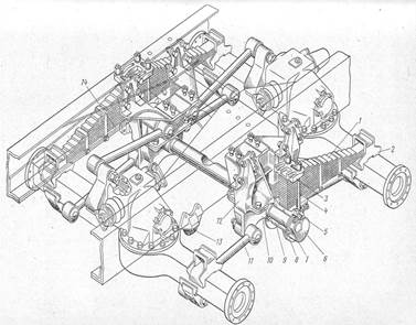 Рессора 1 средней частью прикреплена к ступице 9 посредством накладки 3 и стремянок 4. Концы рессоры свободно установлены в опорах 2, приваренных к балкам мостов. Ступица размещена на конце оси 8 на втулке, которая изготовлена из антифрикционного материала и запрессована в ступицу. Ступица I закреплена на оси гайкой 7 и снаружи закрыта крышкой 6. В крышке имеется отверстие с пробкой 5 для заливки масла, а в ступице — отверстие с пробкой для его слива. Для предотвращения вытекания смазки и защиты ступицы от загрязнения с внутренней ее стороны установлены самоподжимной сальник, а также уплотнительные кольца. Ось 8 запрессована в кронштейны 10 и установлена на раме поперек автомобиля в кронштейнах 12. Каждый мост соединен с рамой тремя продольными реактивными штангами 11. Концы этих штанг закреплены в кронштейнах на раме и мостах. Для крепления используются неразборные шаровые шарниры, которые запрессованы в головки штанг. Шарнир состоит из шарового пальца, обоймы и вкладыша. Вкладыш изготовлен из тканой ленты, пропитанной специальным составом. Шарнир уплотнен защитным чехлом, под который заложена смазка. Ход мостов вверх ограничивается резиновыми буферами 13, установленными на лонжеронах рамы, а ход мостов вниз — специальным отбойным листом 14, который находится между ступицей и рессорой.
