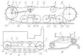 Гусеничний рушій (рис. 1, а) поєднує ведучу зірочку 10, гусеничний ланцюг 8, опорні котки 11, що направляють колесо 3 з натяжним пристроєм і підтримувальні ролики 9.