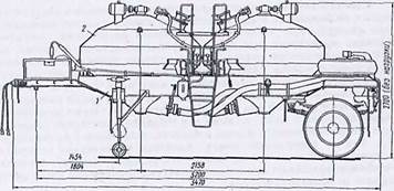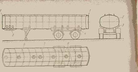 В верхней части цистерны расположены наливная горловина 2 и дыхательный клапан 3. К днищу цистерны приварен шкворень для сцепки с седельным устройством автомобиля-тягача.