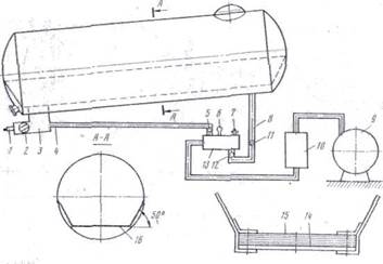 Клапан 4 служит для предохранении трубопроводов и вакуумного насоса от попадания к них известкового молока в случае переполнения цистерн при загрузке под действием разрежения. Закрытие клапана происходит при верхнем уровне известкового молока на 100 мм ниже центра глазка 11. При подъеме уровня наполняемого известкового молока клапан (мяч) всплывает и прилегает к седлу, перекрывая отверстие трубопровода вакуумной системы, которая предназначена дли создания вакуума в цистернах при их наполнении известковым молоком под действием paзрежения (время наполнения одной цистерны 5 мин), а также для создания в цистернах давления при сливе известкового молока в емкости, находящиеся на высоте до 3,5...4 м от поверхности земли. Давление в цистернах создается вакуумным насосом при вращении его ротора в сторону, противоположную вращению при создании вакуума. Вакуумный насос имеет привод от электродвигателя.