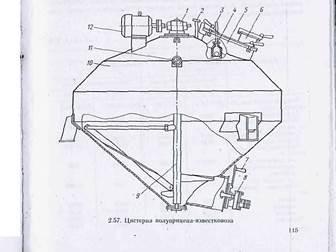 толщиной 4 мм, состоит из средней цилиндрической части, нижнего, промежуточного и верхнего конусов. Нижний и верхний конусы имеют фланцы. К корпусу цистерны приварены три опоры, которыми цистерна опирается на поперечины и лонжероны рамы полуприцепа. Горловина 5, расположенная в верхнем конусе корпуса цистерны, имеет крышку; между ними устанавливается резиновая прокладка-уплотнитель, крышка прижимается к горловине четырьмя откидными болтами. Горловина позволяет иметь доступ внутрь цистерны при установке и ремонте перемешивателя 9.