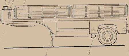 Полуприцеп М-830 (рис. 6) представляет собой сочетание резервуара 1 для перевозки жидкостей и бортовой платформы 4, расположенной над резервуаром. Цистерна несущей сварной конструкции состоит из четырех основных элементов: бака с закругленными углами в плане, передней, средней и задней частей, имеющих прямоугольное сечение. Ступенчатое расположение днища цистерны обеспечивает снижение центра тяжести полуприцепа и размещение заданной ее вместимости с минимальным увеличением погрузочной высоты платформы.