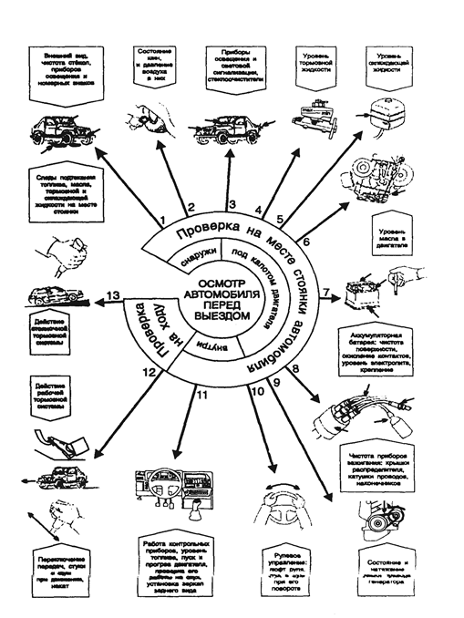 Схема контрольного осмотра автомобиля перед выездом приведена на рисунке.