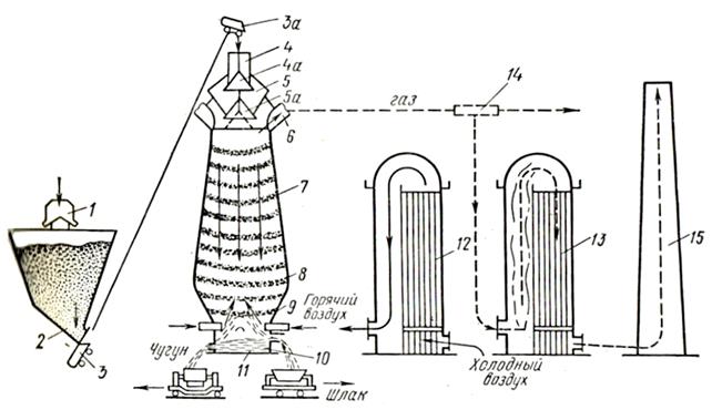 Для достижения высоких температур и форсирования плавки шихты в печь подают горячий воздух 6 (дутьё). Холодный воздух из воздуходувки пропускают через нагретую до 1000 ― 1200˚С насадку воздухонагревателя 12 . В результате воздух нагревается до 780 ― 950˚С. Пока один воздухонагреватель 12 отдаёт тепло кладки холодному воздуху (и в результате остывает), второй воздухонагреватель 13 нагревается до температуры 1200˚С, т. е. регенерирует тепло выделяющееся при сжигании доменного газа, предварительно очищённого то пыли в газоочистителе 14 ; продукты горения удаляются в дымовую трубу 15 . После остывания насадки воздухонагревателя 12 и достаточного нагрева насадки воздухонагревателя 13 производят перекидку клапанов; холодный воздух направляется в воздухонагреватель 13 , а воздухонагреватель 12 нагревается. Обычно воздухонагреватель работает на нагрев дутья около 1ч и на разогрев огнеупорной насадки около 2 ч. Поэтому для бесперебойного обслуживания печи необходимо иметь три воздухонагревателя. Через шлаковую летку 10 удаляется шлак, а через летку 11 ― чугун.