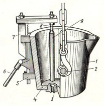 помощи которых ковш захватывается крюком мостового крана. Внутри ковш имеет огнеупорную футеровку 4 из шамотного кирпича. В дно ковша встроен стакан 3 с отверстием для выпуска металла. Отверстие в стакане закрывается огнеупорной пробкой, укреплённой на железном стержне 8 стопора 9 . Подъём и опускание стопора производится вручную при помощи рычага 7 и связанных с ним устройств 5 и 6 .