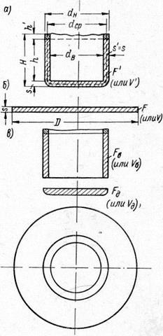 Для определения размеров заготовки при вытяжке исходят из основного законна обработки давлением: вес (G ) и объём (V ) материала до вытяжки ― заготовки должен быть равен весу (G ′ ) и объёму (V ′ ) материала после вытяжки ― готового изделия.