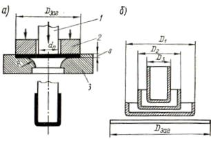 Вытяжкой называется процесс превращения плоской лил полой заготовки в открытое сверху полое изделие, осуществляемый при помощи вытяжных штампов (рис. 5, а ).