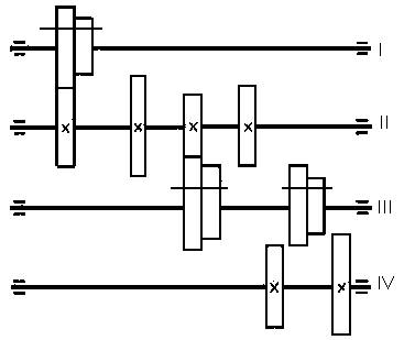 1). На чертеже в произвольном масштабе построим структурную сетку. Количество вертикальных прямых, равное (m +1), соответствует числу валов коробки, в нашем случае, при m = 3, число валов – четыре.