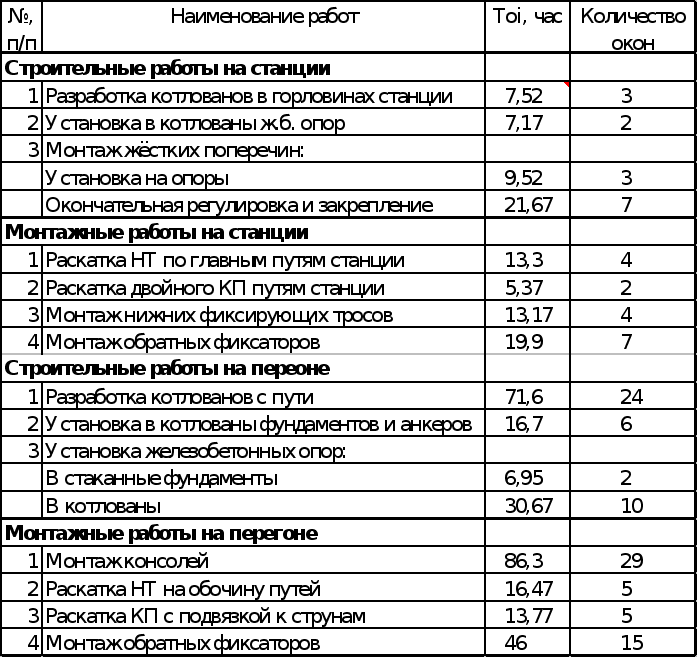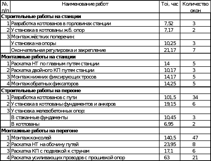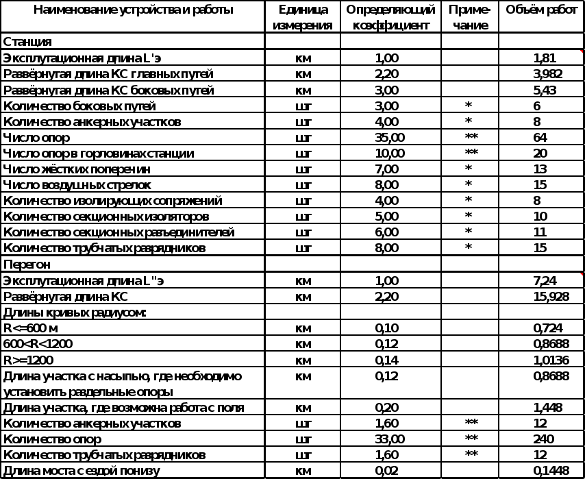 Определяющие коэффициенты, объём работ, станция, перегон, тяговая подстанция (ТП), главный путь, боковой путь, анкерный участок, эксплуатационная длина, горловины станции, развёрнутая длина, опоры, поперечины, строительные работы, монтажные работы, линии электропередач (ЛЭП), посты секционирования, норма времени, норма выработки, трудоёмкость, контактная сеть (КС) и её элементы, сооружение и монтаж элементов контактной сети и тяговой подстанции, “окна”, план производства работ (ППР).