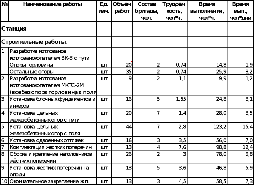 | № | Наименование работы | Ед. изм. | Объём работ | Состав бригады, чел. | Трудоём-кость, чел-ч. | Время выполнения, чел-ч. | Время вып., чел-дни |