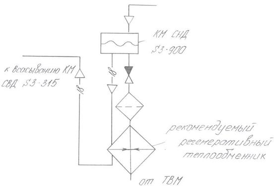 КМ НД засасывает пар хладагента из отделителя жидкости через регенеративный теплообменник и сжимает его до промежуточного давления.