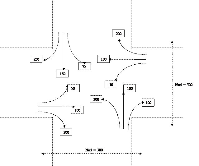 В дальнейшем количество полос для движения транспорта может быть увеличено в зависимости от схемы пофазного разъезда и величины фазовых коэффициентов. Поэтому на данном этапе определение геометрических параметров является приблизительным. nп3 =300/200 = 1,5 nп 4 =500/200 = 2,5 |