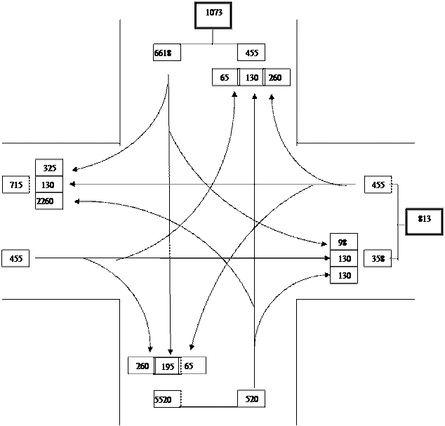 | 5 ТЕХНИКО-ЭКОНОМИЧЕСКАЯ ОЦЕНКА ВНЕДРЕНИЯ СВЕТОФОРНОГО ОБЪЕКТА 5.1 Определение конфликтной загрузки пересечения Конфликтная загрузка пересечения определяется взаимодействием транспортных потоков и будет различной до и после внедрения светофорного регулирования. Поэтому необходимо провести анализ конфликтных точек. Для этого на графическом листе формата А4 в произвольном масштабе вычерчивается схема перекрестка, на которую наносятся разрешенные траектории движения транспортных средств до внедрения светофорного регулирования. Количество точек и интенсивности определяются по картограмме интенсивностей и схеме конфликтности перекрестка, например, рисунок Ж.2 приложения Ж. При внедрении светофорного регулирования число конфликтных точек сокращается и довольно часто снижается степень опасности оставшихся, что является эффективным средством обеспечения безопасности движения. Поэтому по схемам пофазного разъезда проводится анализ конфликтных точек и определяется конфликтная загрузка для каждой фазы. Конфликтность определяется по одной из методик, предложенных преподавателем в лекционном курсе. Простейший метод с учетом интенсивностей транспортных потоков — определение индекса конфликтности по формуле