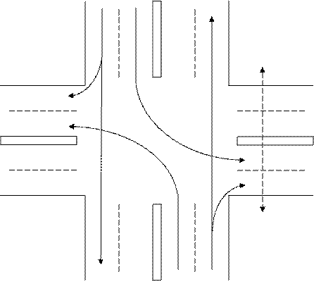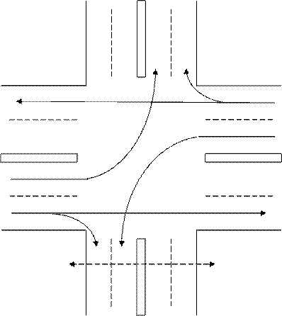 Для транспортных потоков ширину полосы движения следует принимать b = 3,75 м, для пешеходных – b = 1,0 м. Конфигурация и размеры перекрестка определяются количеством полос и их размерами, а также необходимыми отступами пешеходных переходов от стоп-линии и от границ проезжей части перекрестка.