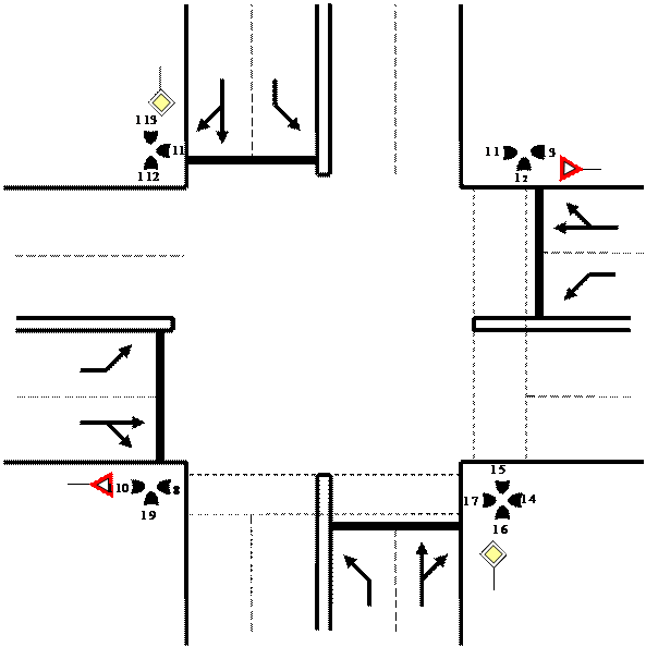 | 6 ПРОЕКТИРОВАНИЕ ТЕХНИЧЕСКИХ СРЕДСТВ РЕГУЛИРОВАНИЯ ДОРОЖНОГО ДВИЖЕНИЯ Следующее задание является последним и завершающим в выполнении курсовой работы. На этом этапе назначаются необходимые технические средства регулирования и разрабатывается дислокация светофоров, дорожных знаков, дорожной разметки, островков безопасности и направляющих ограждений. На графическом листе формата А4 выполняется схема пересечения в масштабе со всеми применяемыми техническими средствами регулирования дорожного движения. Знаки, разметка и светофоры обозначаются условными символами с указанием нумерации согласно правилам дорожного движения или соответствующим ГОСТам /8,9,10/. (Приложение В) В курсовой работе желательно наиболее полное применение всех технических средств, обеспечивающих оптимальную организацию дорожного движения. Необходимо обозначить приоритеты в движении на случай отключения светофорного регулирования, специализировать по направлениям полосы движения при необходимости, предписать или запретить движение по направлениям, обозначить пешеходные переходы и т.д. Для пешеходов необходимо предусмотреть пешеходные светофоры и ограждения в местах запрещения их движения. На отдельном листе формата А4 вычерчивается диаграмма подключения светофорного объекта к контроллеру. (Приложение Г). В отдельные ленточки объединяются основные, дублирующие светофоры, дополнительные секции и пешеходные светофоры, работающие по одинаковому алгоритму. Необходимо учитывать разницу в работе транспортного светофора, дополнительной секции и пешеходного светофора. |