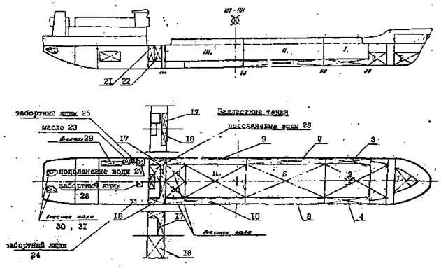Схематический продольный разрез и вид на верхняя палубу судна приведены на Рисунке 1.1.
