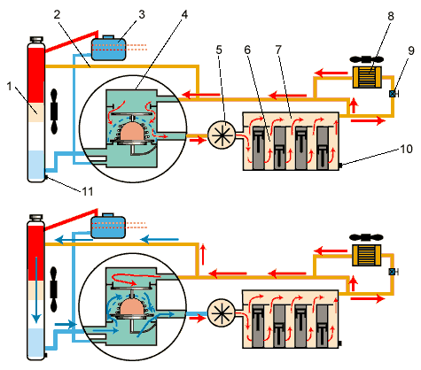 При жидкостном охлаждении циркулирующая в системе охлаждения двигателя жидкость воспринимает тепло от стенок цилиндров и камер сгорания и передает затем это тепло при помощи радиатора окружающей среде.