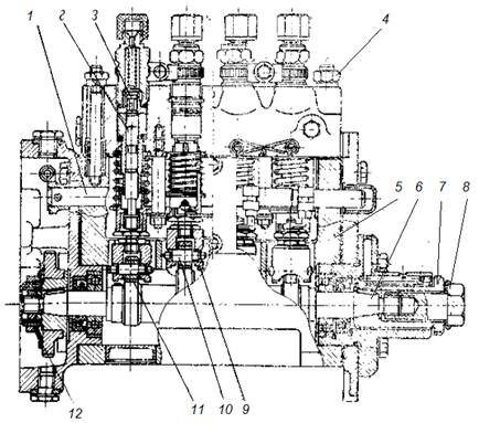 1 – рейка; 2 –плунжерная пара; 3 – нагнетательный клапан; 4 – головка; 5 – корпус насоса; 6 – кулачковый вал; 7 – установочный фланец; 8 – фланцевая втулка; 9 – корпус толкателя; 10 – ось ролика; 11 – ролик толкателя; 12 – пружина фрикционная