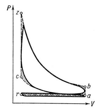 Теоретическая (пунктир) и действительная (сплошные линии) индикаторные диаграммы 4—тактного карбюраторного двигателя: ra — линия впуска; ac — линия сжатия; cz — линия сгорания; zb — линия расширения; br — линия выпуска; P давление; V — объём.