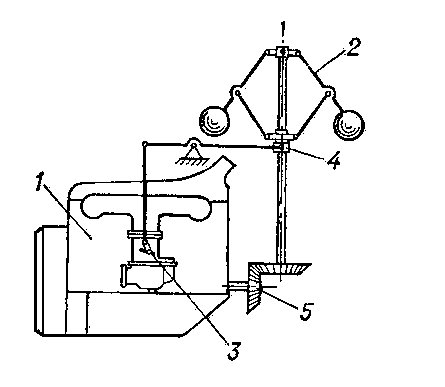 Простейший пример САУ — система прямого регулирования частоты вращения двигателя (рис. 1). Цель управления — поддержание постоянной частоты вращения маховика, управляемый объект — двигатель 1; управляющее воздействие — положение регулирующей заслонки дросселя 3; УУ — центробежный регулятор 2, муфта 4 которого смещается под действием центробежных сил при отклонении от заданного значения частоты вращения вала 5, жестко связанного с маховиком. При смещении муфты изменяется положение заслонки дросселя. Структурная схема рассмотренного примера (рис. 2) типична для многих САУ вне зависимости от их физической природы. Описанная система представляет собой замкнутую одноконтурную непрерывную систему автоматического регулирования механического действия, допускающую линеаризацию (См. Линеаризация) при исследовании.