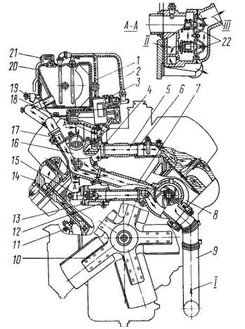 Система охлаждения двигателя жидкостная закрытого типа с принудительной циркуляцией охлаждающей жидкости. Основными элементами системы (рис. 1) являются водяной насос 8, радиатор, термостаты 22, вентилятор 10, гидромуфта привода вентилятора, включатель 15 гидромуфты, расширительный бачок 20, перепускные трубы, жалюзи.