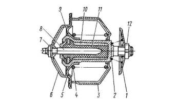 1 - шкив; 2 - болт; 3, 10 - шайбы; 4, 6 - подшипники; 5 - пресс-масленка; 7 - манжета; 8 -кольцо уплотнительное с обоймой; 9 - валик; 11- гайка колпачковая; 12 - кольцо упорное; 13 - уплотнение (сальник); 14 - крыльчатка; 15 - кольцо стопорное; 16 -пылеотражатель
