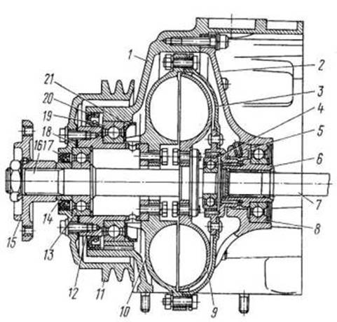 1 - крышка передняя; 2 - корпус подшипника; 3 - кожух; 4, 8, 13, 19 -подшипники шариковые; 5 - трубка корпуса подшипника; 6 - вал ведущий; 7 - вал привода гидромуфты; 9 - колесо ведомое; 10 - колесо ведущее; 11 - шкив: 12 - вал шкива; 14 - втулка упорная; 15 - ступица вентилятора; 16 - вал ведомый; 17, 20 - манжета с пружинами; 18 - прокладка; 21 – маслоотражатель