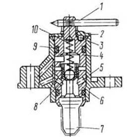 1,5- клапаны; 2, 4 - пружины; 3, 6 -стойки; 7, 12 - гайки регулировочные; 8 - шток; 9 -баллон; 10 - масса активная (церезин); 11 - вставка резиновая с шайбой