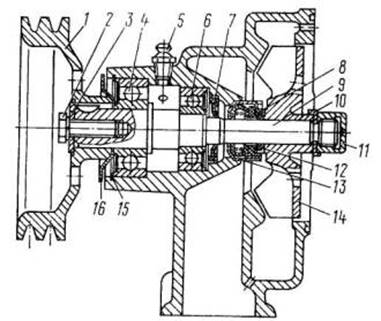 Насос водяной (рис. 6) центробежного типа, установлен на передней части блока цилиндров слева. На шкив 1 насоса крутящий момент передается ремнями от шкива гидромуфты, который вращается с угловой скоростью, равной частоте вращения коленчатого вала.