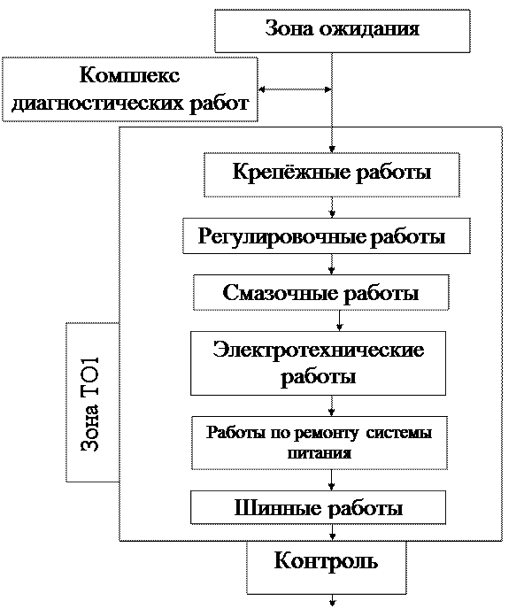 Из зоны ожидания автомобиль попадает зону ТО1.В зоне ожидания автомобиль проходит диагностирование для того чтобы снизить время общих работ в зоне ТО, при данном методе диагностирования можно выявить серьезные неполадки требующие постановки автомобиля на текущий ремонт и автомобиль сразу направить в зону текущего ремонта. В зоне ТО1 путём проведения установленного комплекса работ (крепёжные, регулировочные, смазочные, электротехнические и т.д.) выявляют и предупреждают отказы и неисправности, а также снижают интенсивность изнашивания деталей, узлов и механизмов для поддержания автомобиля в технически исправном состоянии. Из зоны ТО1 автомобиль попадает в зону контроля, где проводят контроль качества проведения ТО1.Схеме технологического процесса ТО1 представлена ниже на рисунке
