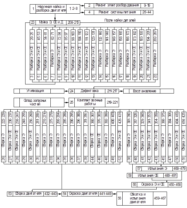 В первой главе произошло ознакомление с устройством двигателя и была построена структурная схема изделия. Также была составлена таблицы маршрутов и процессов ремонтов, где зная трудоемкости выполнения тех или иных операций, скомпоновали участки.