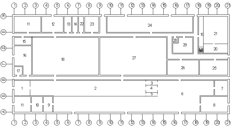 1 – Моечно-разборочный участок; 2 – Разборочный участок; 3 – Моечное отделение; 4 – Дефектовочное отделение; 5 – Комплектовочное отделение; 6 – Сборочный участок; 7 – Окрасочное отделение; 8 – Отделение испытания элементов и сборочных единиц; 9 – Отделение испытания двигателей; 10 – Отделение окраски двигателей; 11 – Штамповочный участок; 12 – Сварочно-наплавочный участок; 13 – Термическое отделение; 14 – Гальваническое отделение; 15 – Металлизационное отделение; 16 – Кузнечный участок; 17 – Медницко-жестяницкое отделение; 18 – Склады общехозяйственные; 19 - Бытовые помещения;; 20 – Здравпункт; 21 – Конторское помещение; 22 – Электроремонтное отделение; 23 – Ремонт топливной аппаратуры; 24 – Слесарный участок; 25 – Сборочный участок; 26 – Цеховые склады; 27 – Станочный участок; 28 Эмульсионное отделение; 39 – ЦРК с заточным отделением.