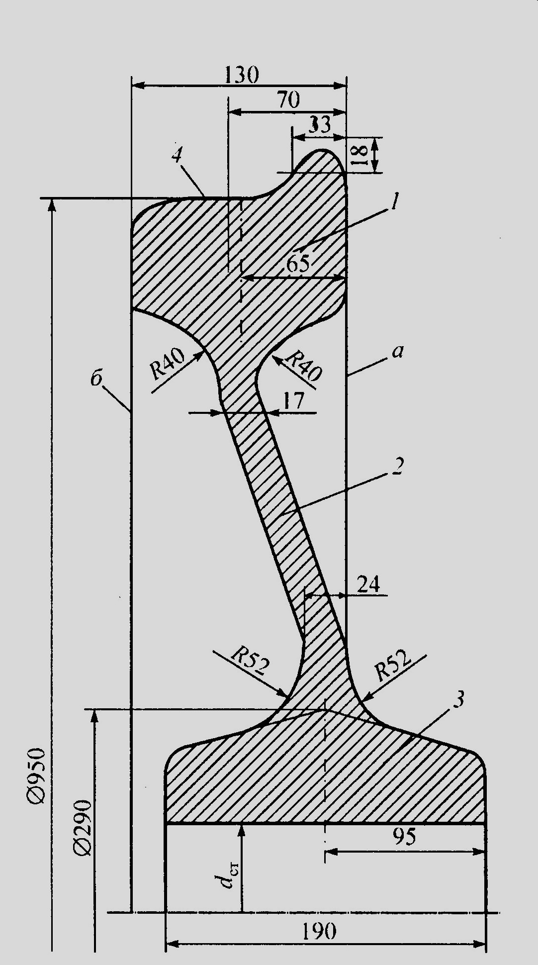 Стальное цельнокатаное колесо (Рис. 2.) состоит из обода 1, диска2 и ступицы 3. Рабочая часть колеса представляет собой поверхность катания 4. Номинальный размер ширины обода составляет 130 мм. На расстоянии 70 мм от внутренней грани и обода, являющейся базовой, расположен воображаемый круг катания, используемый для измерения специальными инструментами диаметра колеса, толщины обода и проката. Противоположная грань б называется наружной. Ступица 3 с ободом 7 объединены диском 2, расположенным под некоторым углом к плоскости круга катания, что придает колесу упругость и способствует снижению уровня динамических сил во время движения вагона. Ступица служит для посадки колеса на подступичной части оси. Поверхность катания 4 обрабатывается по стандартному профилю.