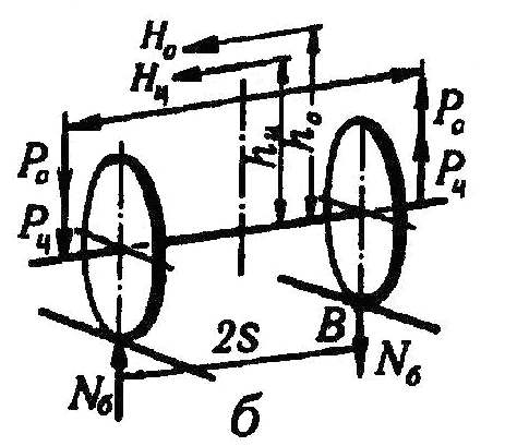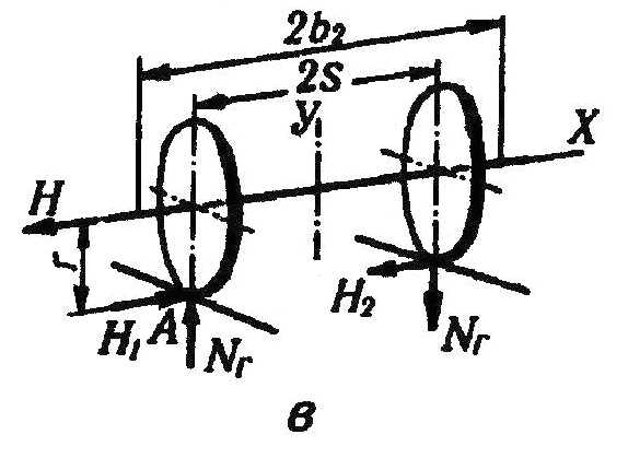 а - вертикальные статические и динамические силы; б - вертикальные силы от горизонтальных нагрузок; в - горизонтальные нагрузки от центробежной силы и ветровой нагрузки; г - вертикальные нагрузки от сил инерции необрессоренных масс