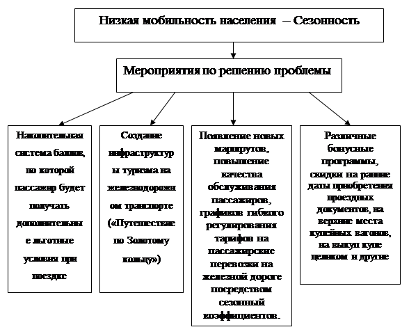 В стадии разработки находятся новые маркетинговые инициативы: скидки на ранние даты приобретения проездных документов, на верхние места купейных вагонов, на выкуп купе целиком и другие. Дерево решений по проблеме «Низкая мобильность населения – Сезонность» представлено на рисунке 3.