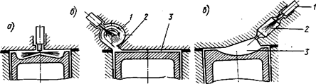 В автотракторных дизелях применяют два типа камер сгорания: не-разделенные и разделенные. Неразделенные камеры сгорания (рис. 1, а) представляют собой единый объем, заключенный между днищем поршня и поверхностью головки, в котором происходит процесс смесеобразования и сгорания топлива, впрыснутого через форсунку. Тонкость распыливания и необходимая дальнобойность факела обеспечиваются большим давлени-ем впрыска, равным 20—60 МПа, и малым диаметром сопловых отвер-стий форсунки. Равномерное распределение частиц топлива в объеме сжа-того воздуха достигают применением многодырчатых форсунок.