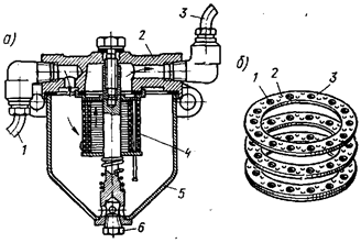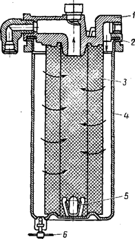 Фильтр грубой очистки очищает от крупных частиц (40—80 мкм) механических примесей. Он включается в систему между баком и топли-воподкачивающим насосом. Фильтр грубой очистки (рис. 3) состоит из корпуса 4 , крышки 1 , фильтрующего элемента 3 и крана 6 для слива от-стоя. Фильтрующий элемент состоит из сетчатого металлического карка-са с навитым на него ворсистым хлопчатобумажным шнуром. Правиль-ность установки фильтрующего элемента обеспечивается розеткой 5 . Между корпусом 4 и крышкой 1 установлена прокладка 2.
