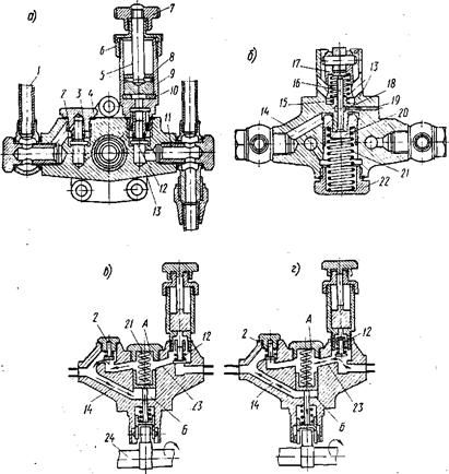 Топливоподкачивающий насос (рис. 4, а, б) состоит из корпуса 13 , поршня 20 с пружиной 21 , роликового толкателя 17 со штоком 16 и пру-жиной 15, всасывающего 12 и нагнетательного 2 клапанов с пружинами 3 и пробок 4 и 22 . Нагнетательный клапан 2 центрируется в пробке 4 . Над всасывающим клапаном расположен насос для ручной прокачки топлива, имеющий отверстие для центрирвания всасывающего клапана.