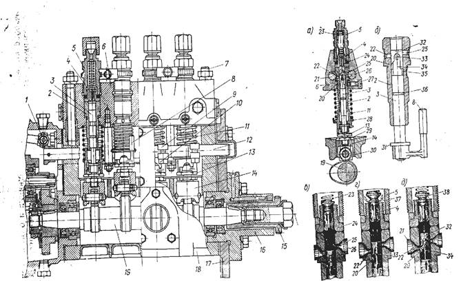 Устройство насоса. Он (рис. 5) состоит из корпуса 18 , кулачкового ва-ла 19 , головки 6 , четырех секций насоса и механизма регулирования коли-чества подаваемого топлива.