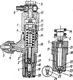 В качестве примера рассмотрим конструкцию и принцип действия за-крытой штифтовой форсунки с гидравлическим управлением иглой. Фор-сунка (рис. 7) состоит из стального корпуса 15 , к которому гайкой 16 кре-пится распылитель 18 с запорной иглой 17 . Игла запарным конусом 23 прижимается к коническому седлу в распылителе посредством пружины 14 и штанги 2 . На нижнем конце иглы 17 имеется конический штифт 24 , который выступает из соплового отверстия. Нижний торец пружины 14 упирается в тарелку штанги 2 , а верхний - в тарелку регулировочного вин-та 12 , который ввернут в гайку 13 , завернутую до упора в корпус форсун-