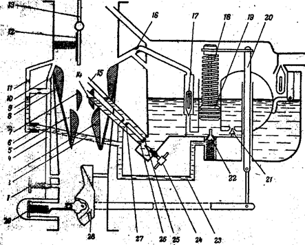 1 -улдеяачный винт; 2 —канал холостого хода; 3 —средний диффузор; 4 —эмульционный канал; 5 -пластина; 6 —жиклер холостого хода; 7 — малый диффузор; 8 — большой диффузор; 9 - эмульционный жиклер; 10 и 11 — воздушные зканслеры; 12 — клапан воздушной заслонки; 13- воздушная заслонка; 14 — распылитель главного жиклёра; 15 —распылитель дополнительного жиклёра; 16 —жиклёр ускорительного насоса; 17 — выпускной клапан; 18 — пружина; 19 —поршень; 20— стержень; 21— обратный клапан; 22 — клапан экономайзера; 23 — канал; 24 — регулировочный винт главного жиклера; 25 — дополнительный жиклер; 26 — главный жиклер; 27 — жиклёр мощности; 28- дроссельная заслонка; 29 — пружина ограничителя оборотов.